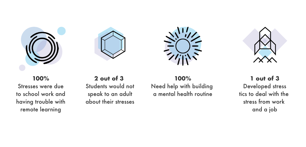 My goal was to understand the challenges teenagers face with taking control of their mental health. I conducted three empathy interviews with participants currently enrolled in high school or university and ranging from 15 to 22 years of age. My questions aimed to define the most important factors at play with their mental health. The interviews helped to address the stress causes, and determine whether they had techniques to help cope with their stress.