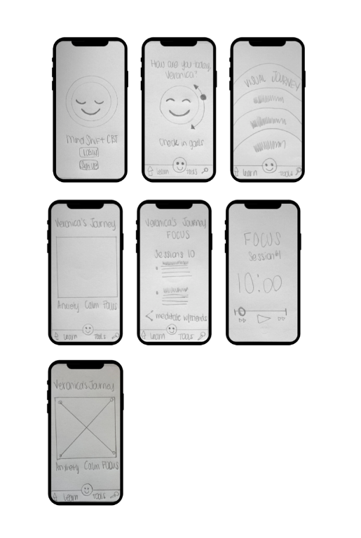 After my interviews, I began developing a visual journal. This evolved into “Your Journey,” a mediation-based mental health routine within the app designed to create a foundation for dealing with stress and cultivating a lasting relationship with positive mental health. I also designed a dashboard to help show user progress and reduce quitting.